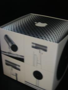 in this review of Apple's new iChat AV & iSight. Review Menu Click here to discuss this article and review » Stage One: The Opening [selected] Stage Two: Putting it all together As soon as we brought back two of the iSight cubes to Naoworld.com Network HQ, we pulled out a digital camera (yes, it is ironic that we used a digital camera to take pictures of a digital camera) to take snaps of the opening and installation of our newest purchase. So, below are images of the opening and a look around at the iSight box. Two sides of the iSight box (yes, we couldn't help but take off the wrapping) Left side of the opened box includes print material (legal and manual) as well as an assortment of three stands, one for a CRT Display, one for a flat panel and one for a Powerbook or iBook laptop. Right side of opened box reveals the camera itself, the iSight sits along side a neat little case to help you keep it from being scratched when your friends and family try to have a look. Once opened we have to say that the box seems to be exactly like or iPod box. Next on the tour is a quick look at the iSight itself.